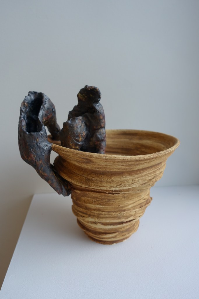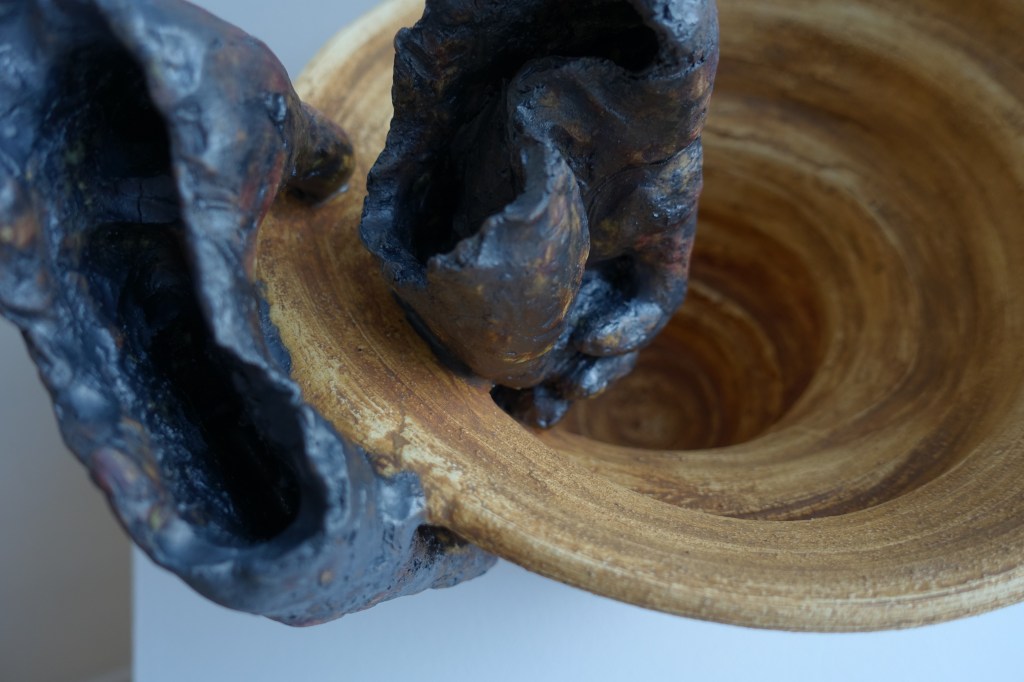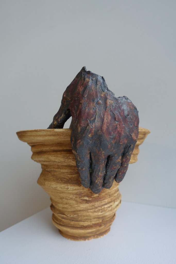 A half-formed vessel on the potter’s wheel and a pair of traditional sculpted hands attached recreate the scene of a potter at work, creating a dialogue between art and craft, inviting reflection on their intertwined nature.